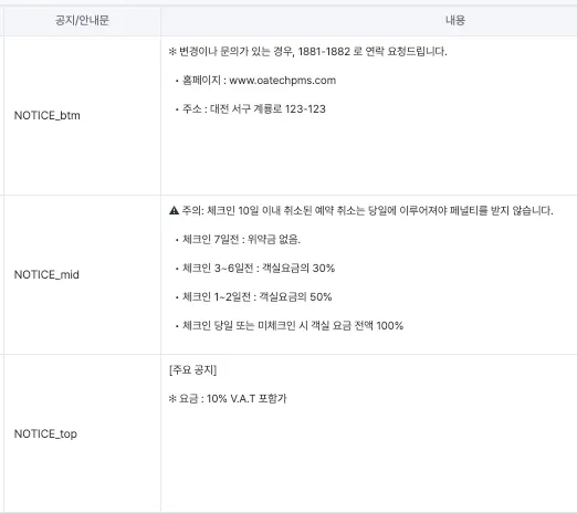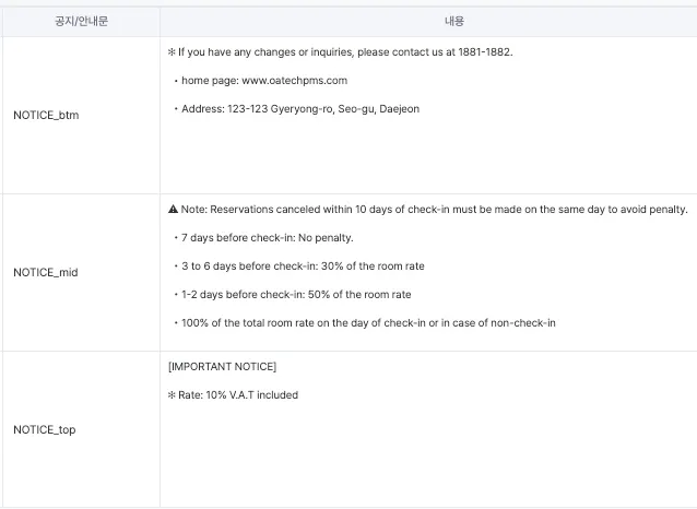A 예약정보 요소는 해당 템플릿의 구성을 의미하며, 고정 값을 두어 템플릿이 제작되어 기본 설정 값이라고 생각해주시면 됩니다, 템플릿에 노출되어지는 입력 값은 변경 가능합니다.