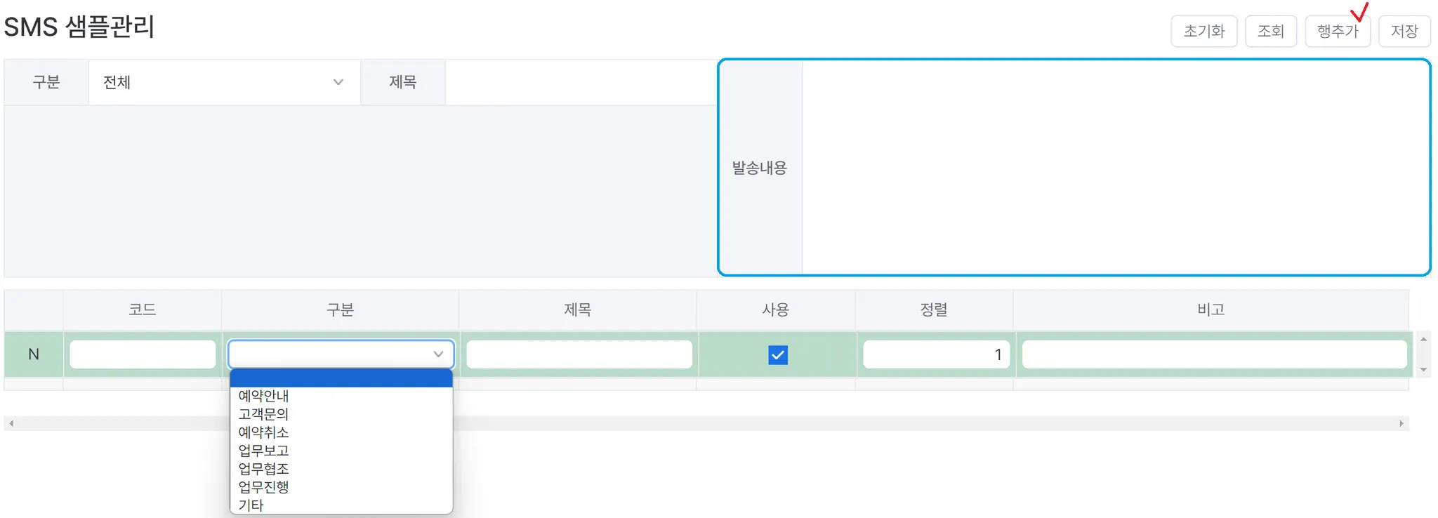 [행추가] 버튼 > 발송내용 기재 > [구분] 값 및 [제목] 입력 > [저장] 클릭