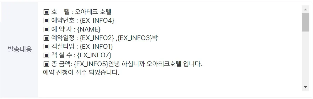 발송내용에 기재되는 정보 값은 이렇게 구성되요.