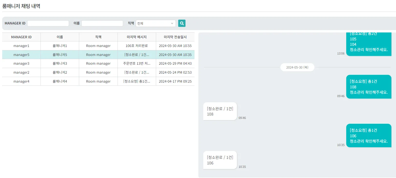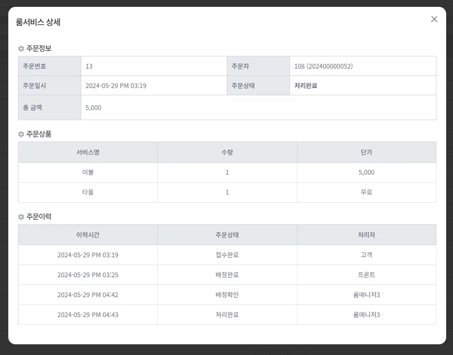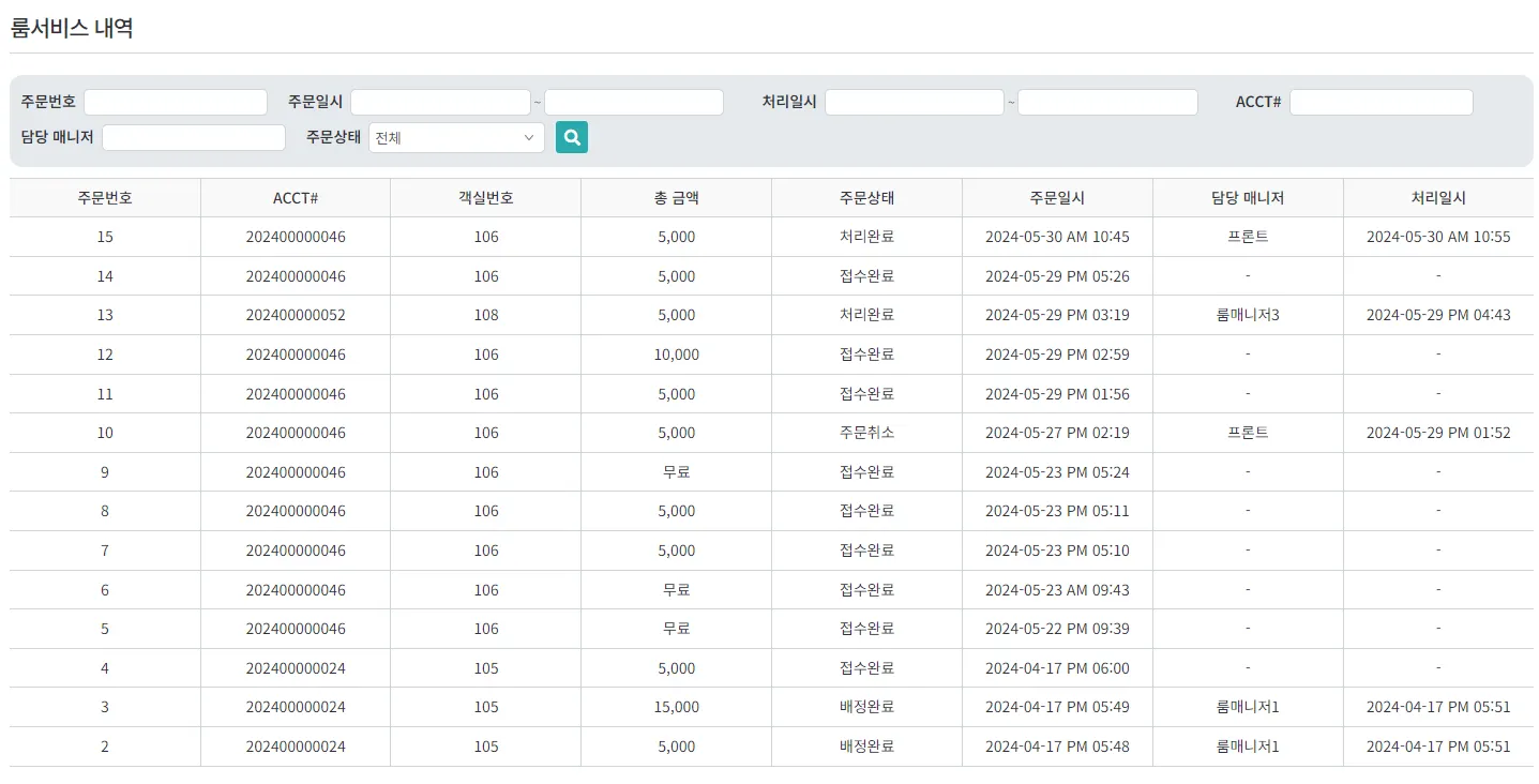 ๋ฃธ์๋น์ค ๋ด์ญ ์กฐํ ๊ฐ๋ฅํ๋ฉฐ, ๋๋ธ ํด๋ฆญ ์ ํด๋น ๋ฃธ์๋น์ค์ ์์ธ ๋ด์ญ์ ํ์ธ ํ ์ ์์
