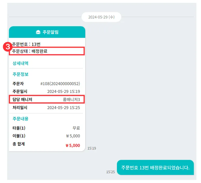 ์ฃผ๋ฌธ์๋ฆผ์ ์ฃผ๋ฌธ์ํ๊ฐ ๋ฐฐ์ ์๋ฃ๋ก ๋ฐ๋๊ณ , ๋ด๋น ๋งค๋์ ๊ฐ ๋ฐฐ์ ๋จ.