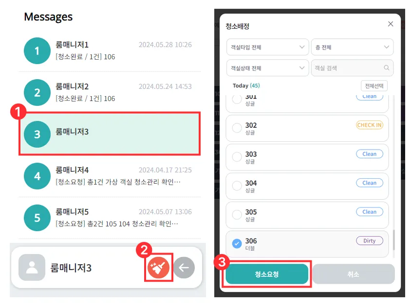 - ์ฒญ์์์ฒญ : ํ๋ก ํธ์์ ๋ฃธ๋งค๋์ ์๊ฒ ์ฒญ์์์ฒญ์ ํ์ ๊ฒฝ์ฐ