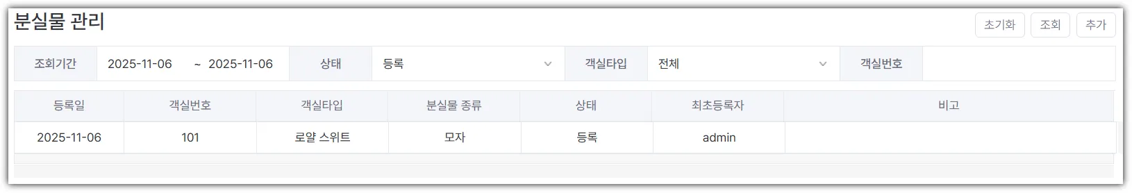 분실물을 습득한 객실번호를 선택합니다.