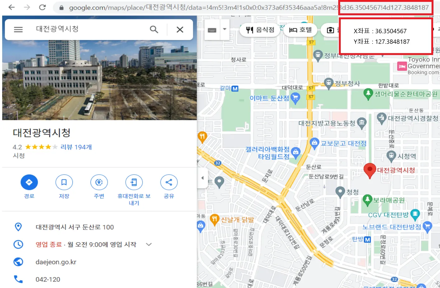 : 구글 지도 접속 → 숙소 또는 주소 검색 → 주소창 우측 위도(X), 경도(Y) 확인