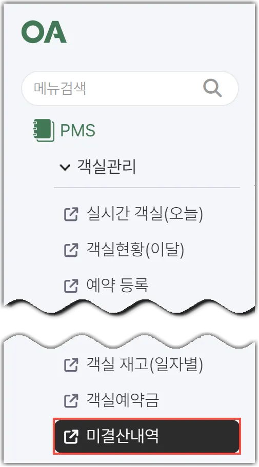 만약 ‘OTA 선결제 간소화’ 세팅이 되어있다면, 바로 미결산내역 페이지에서 일괄 체크아웃처리하시면 되요. (관련 내용은 여기에서 확인)