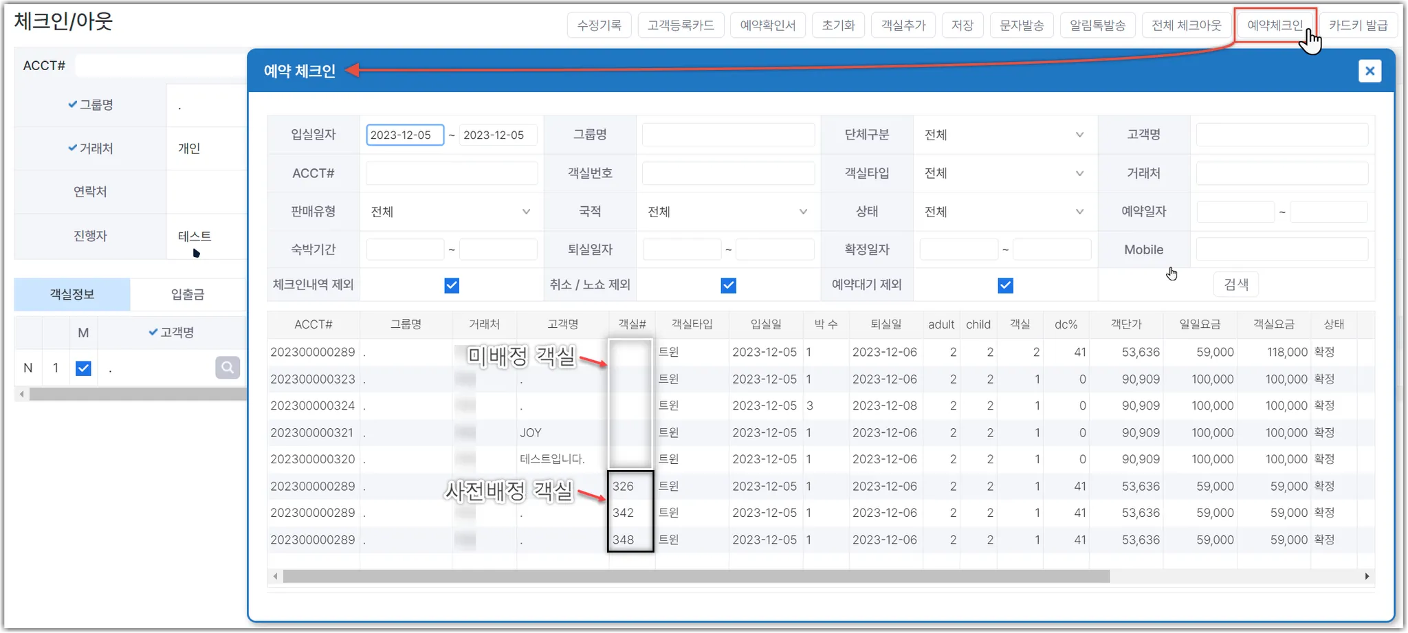 [실시간 객실상태] 에서 ‘예약확정’ 상태 체크
