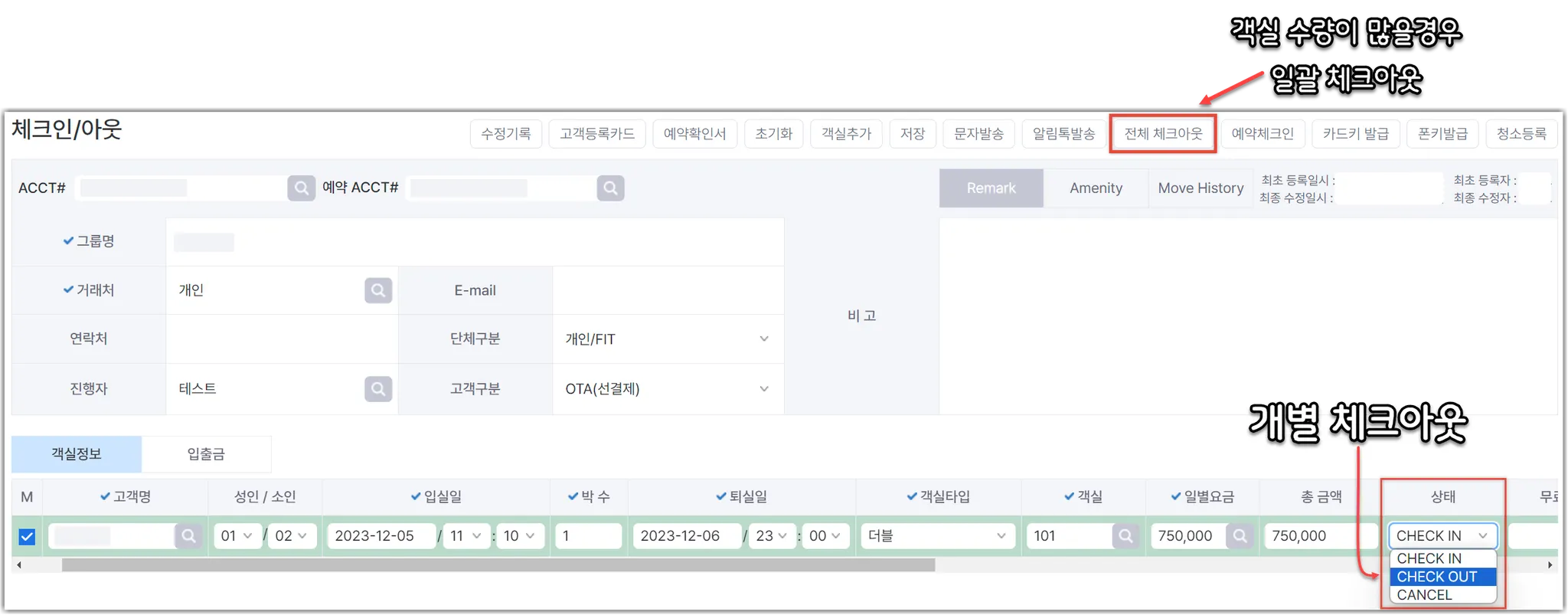 하단 : 객실 정보 탭 ; 입출금 정보 탭