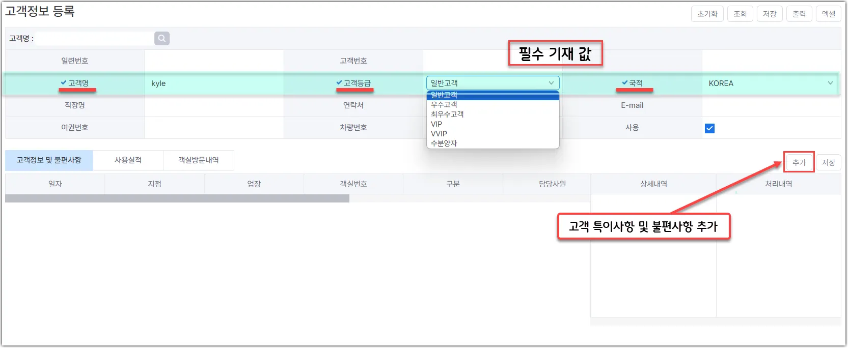 해당 고객의 컴플레인 및 참고사항을 기재 후 저장합니다.