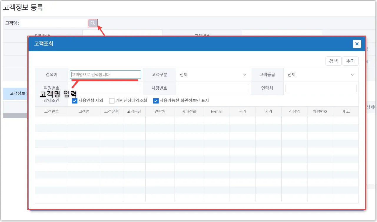 고객명 돋보기를 클릭하여 원하는 검색 필터에 값을 입력하고 검색 버튼을 클릭합니다.