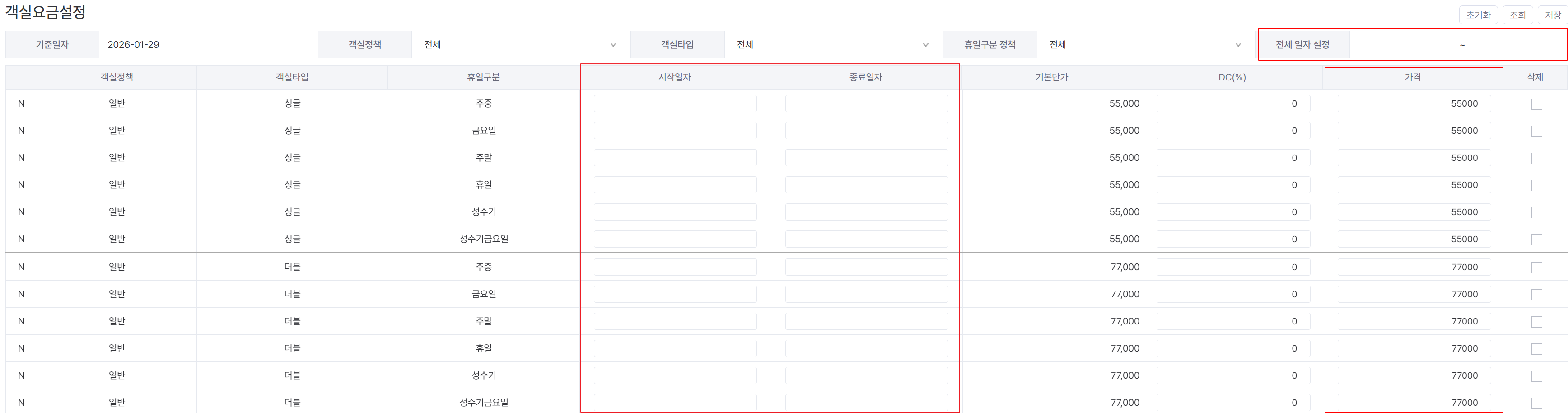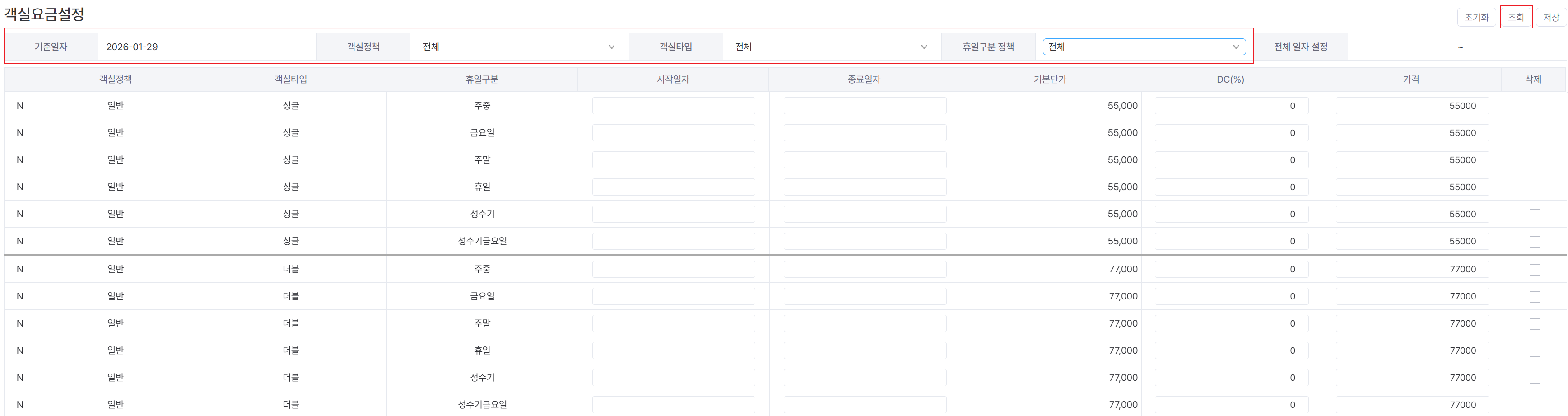 아래 원하는 검색 조건을 입력하여, 객실요금이 어떻게 설정되어 있는지 조회 가능