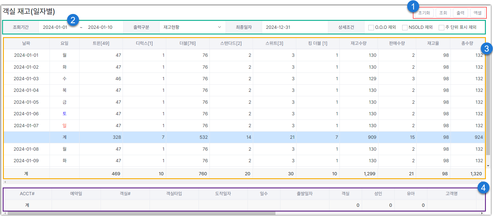 일자별 객실타입별 총 재고수, 재고수량, 판매수량 등 표시