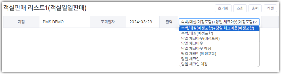 초기화: 조회일자를 오늘 날짜로, 출력 정보를 기본값으로 되돌립니다.조회: 선택한 일자와 원하는 출력 정보로 검색합니다.출력: 인쇄하거나 PDF 파일로 다운로드합니다.엑셀: 엑셀 포맷의 파일을 다운로드합니다.