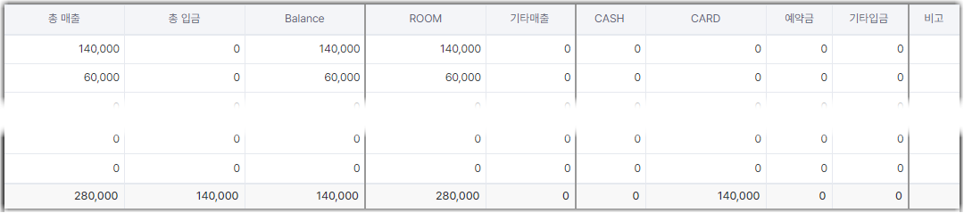 투숙기간 중 총 매출, 입금액과 잔액을 확인합니다.