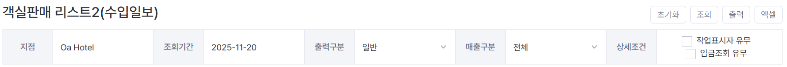 초기화: 조회일자를 오늘 날짜로, 출력 정보를 기본값으로 되돌립니다.조회: 선택한 일자와 원하는 검색필터로 검색합니다.출력: 인쇄하거나 PDF 파일로 다운로드합니다.엑셀: 엑셀 포맷의 파일을 다운로드합니다.