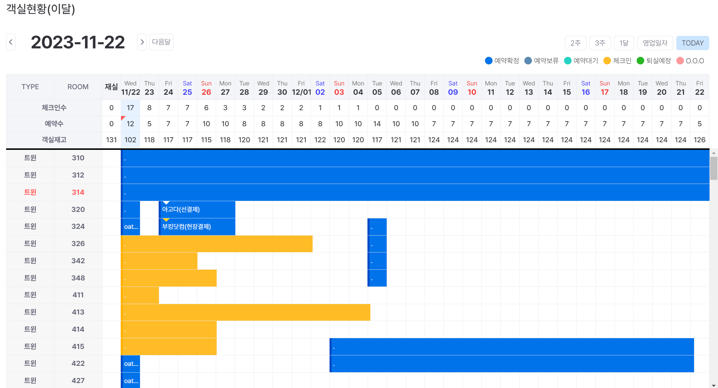 <,>클릭 시, 하루 단위로 앞, 뒤 이동 가능다음달클릭 시, 한달 단위로 다음달 이동 가능일자클릭 시, 캘린더로 원하는 일자 이동 가능2주,3주,1달클릭 시, 클릭한 기간 만큼의 예약 건 표기TODAY클릭 시, 당일(영업일 기준) 체크인/체크아웃 건 확인 가능