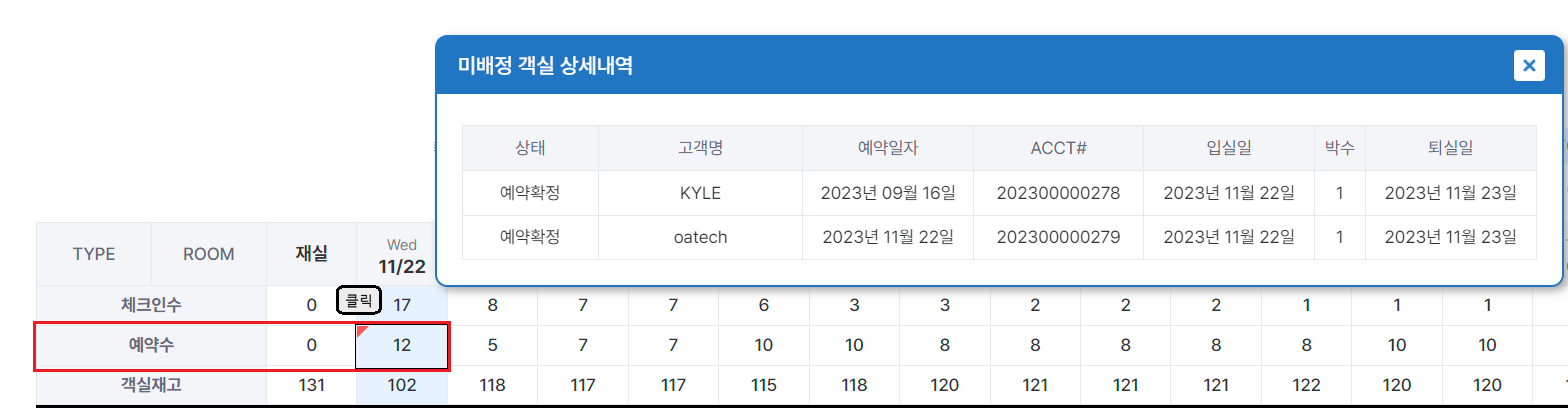 일자 별 체크인 수, 예약건 수, 객실재고 수 표시