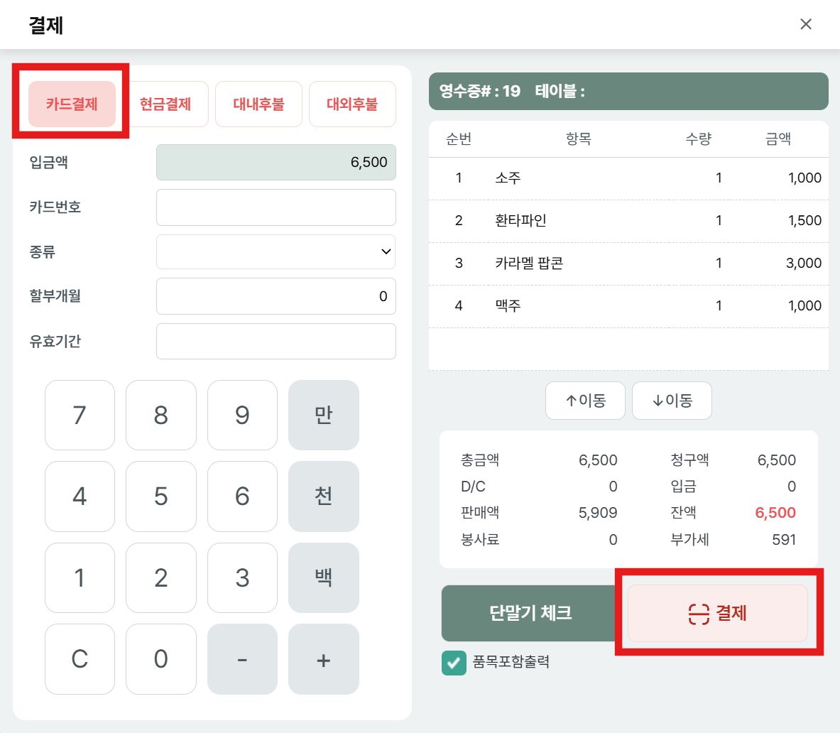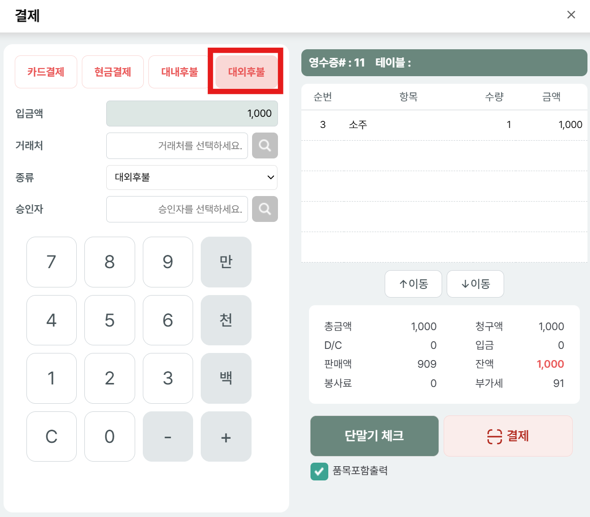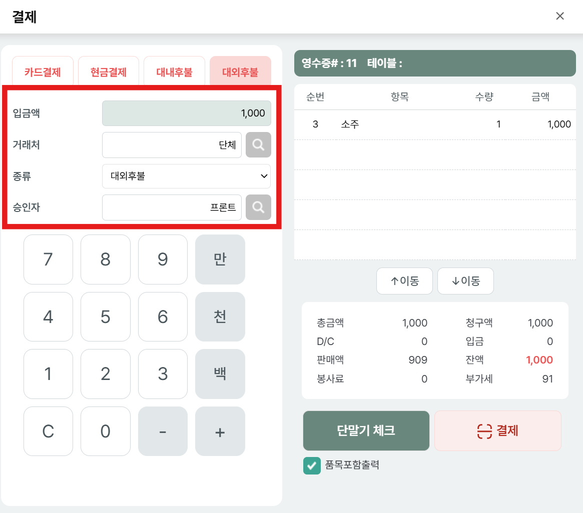 결제 진행 후, 결제 승인 확인 창 팝업에서 확인 선택 시, 단말기에 번호 입력