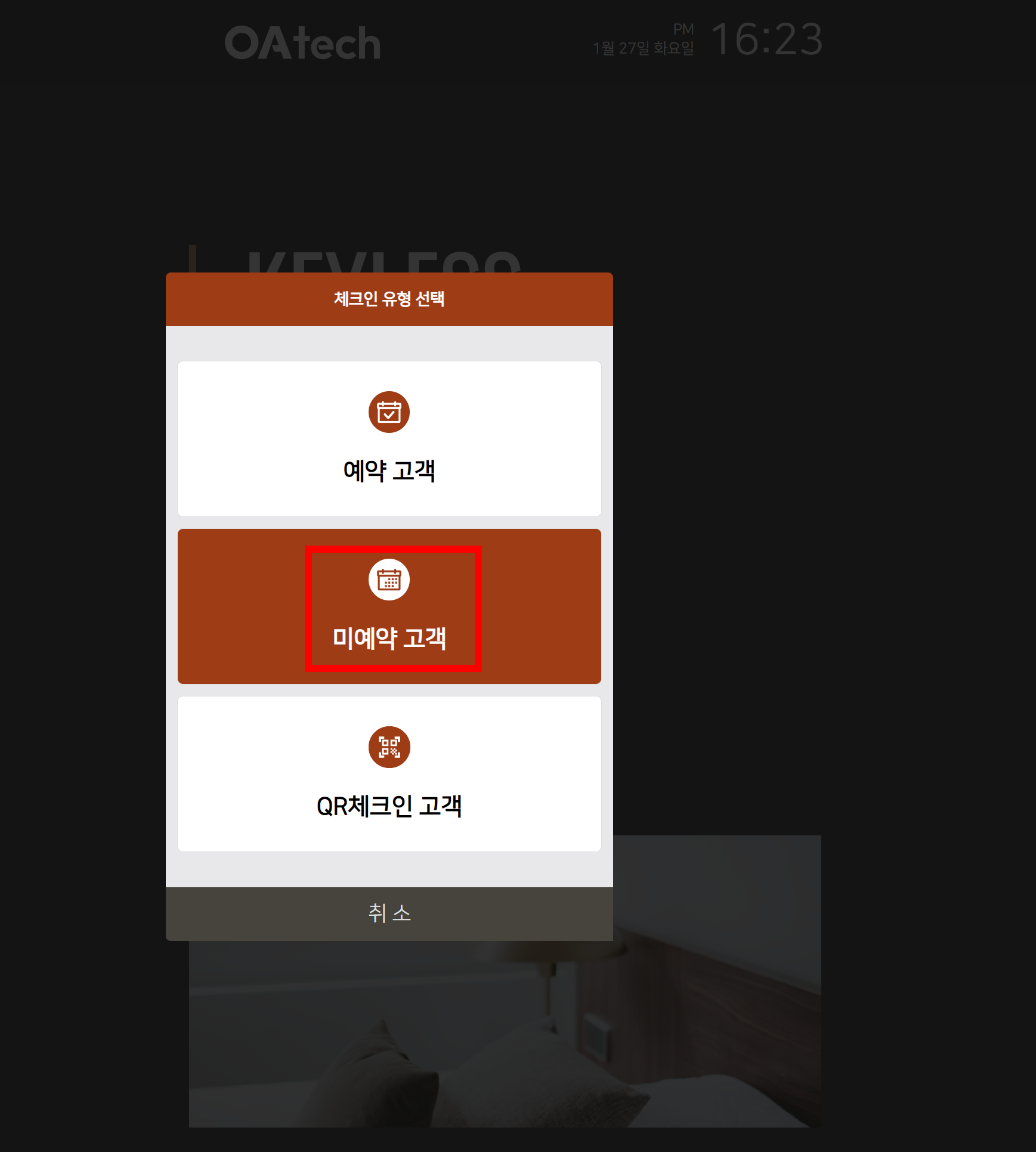 사전 예약 없이 현장 체크인하는 고객의 키오스크 체크인 절차입니다.