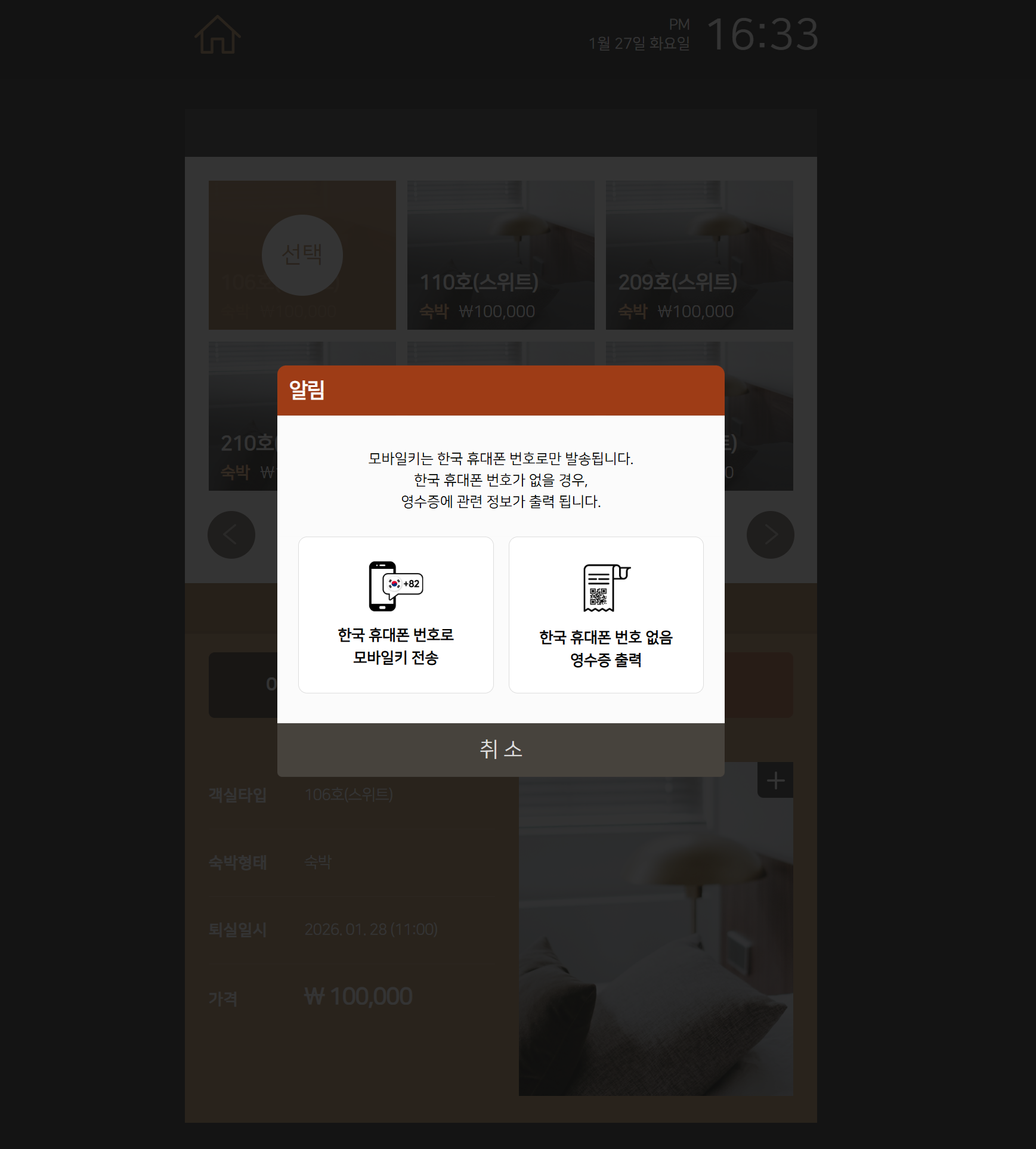 한국 연락처가 없을 경우, [한국 휴대폰 번호 없음 영수증 출력] 버튼 클릭