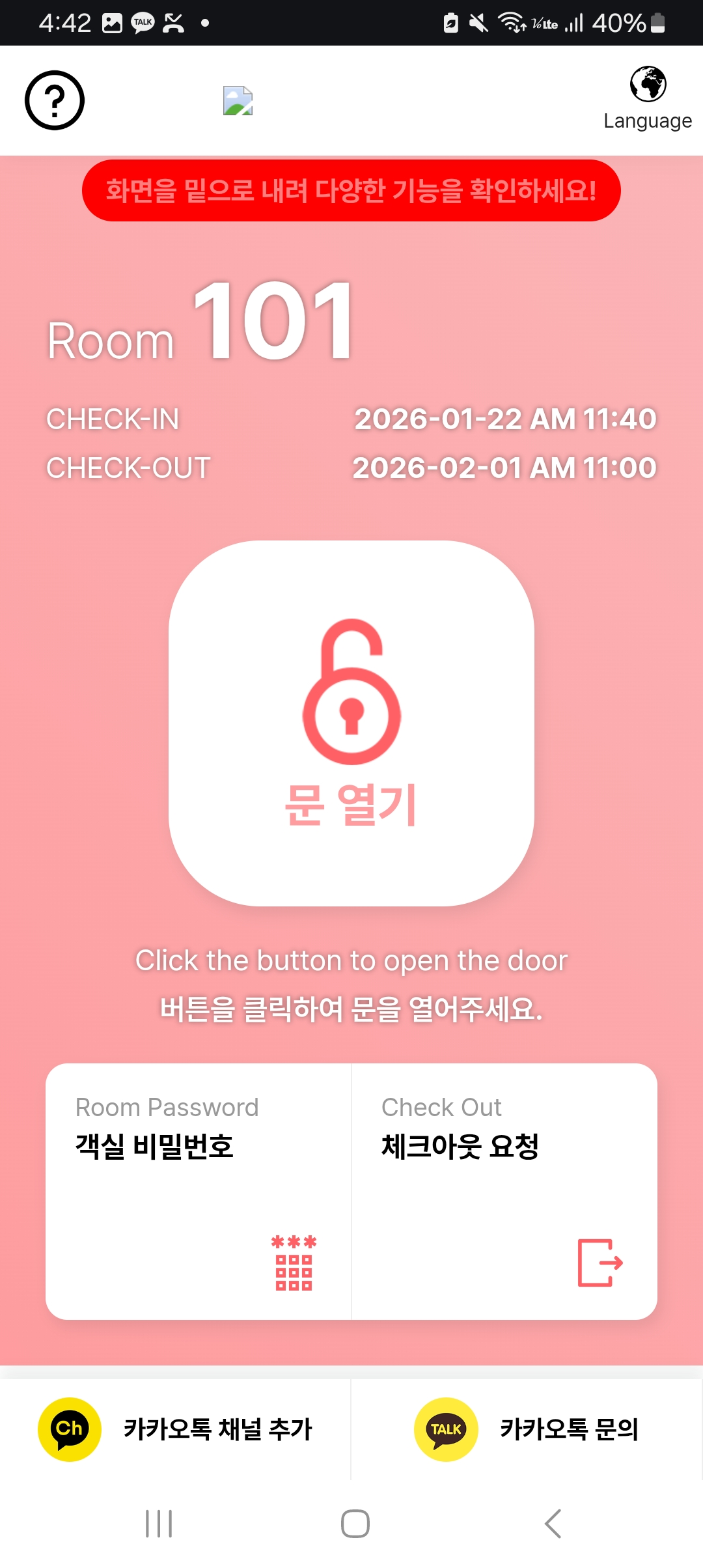 모바일 키는 체크인 시점부터 체크아웃 이전까지 사용 가능합니다.