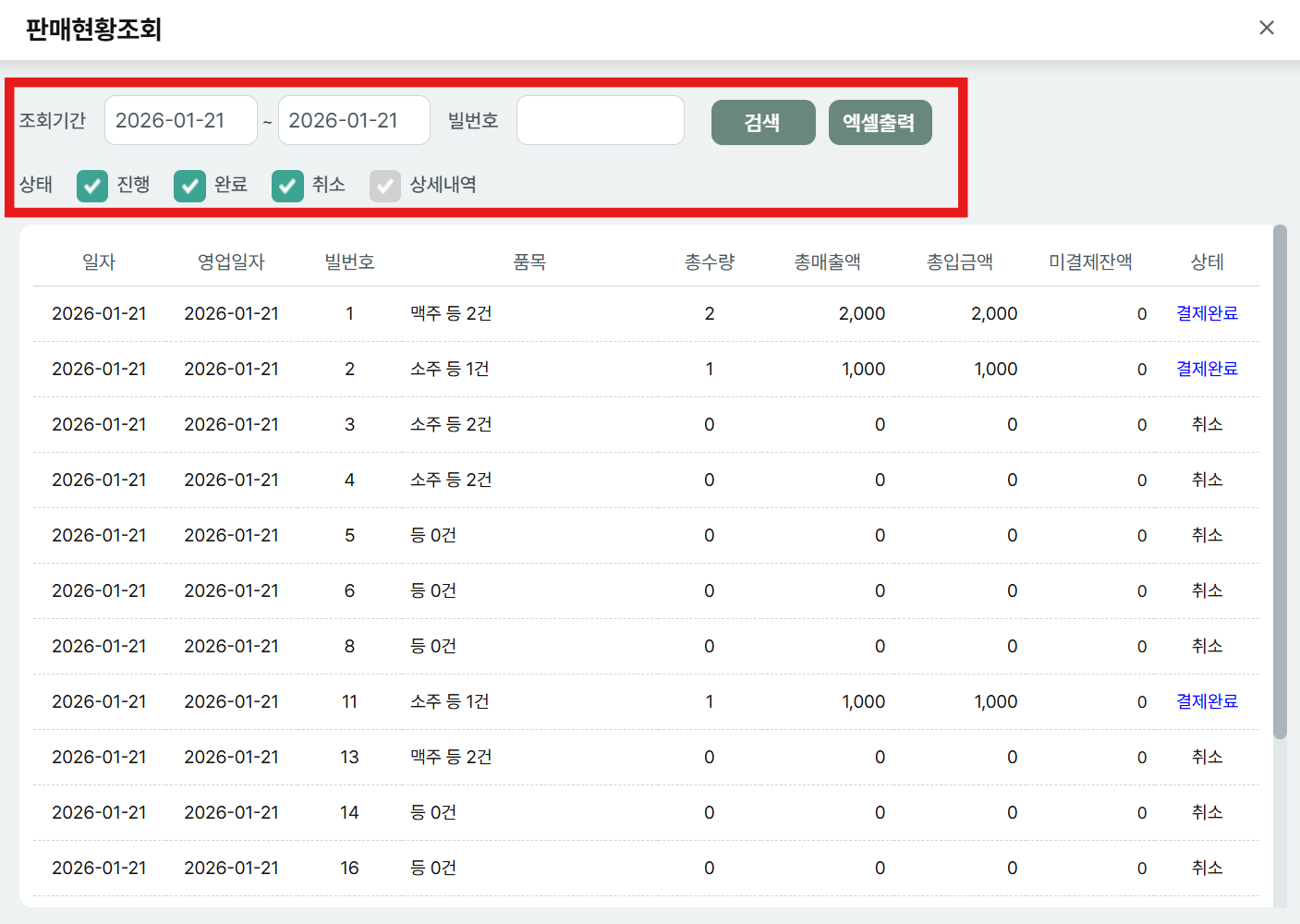 검색 시, 해당 일자의 빌번호/품목총수량/총매출액/총입금액/미결제잔액/상태 확인 가능