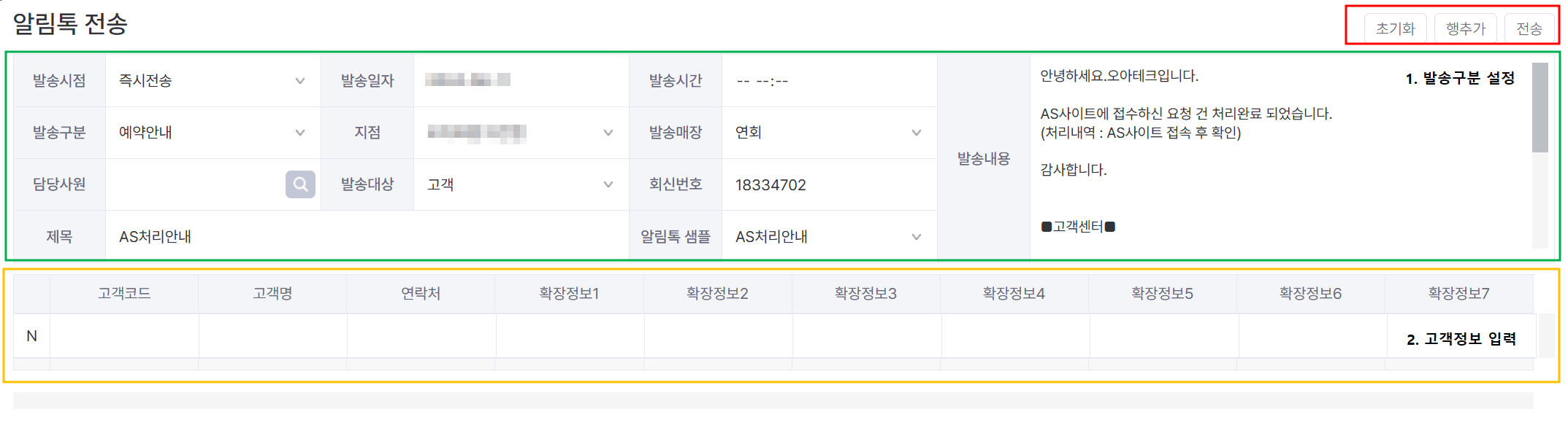 확장정보1~7 : 발송내용에 {EX_INFO1} ~ {EX_INFO7} 입력 시 입력된 확장정보 내용이 자동으로 변환됩니다.