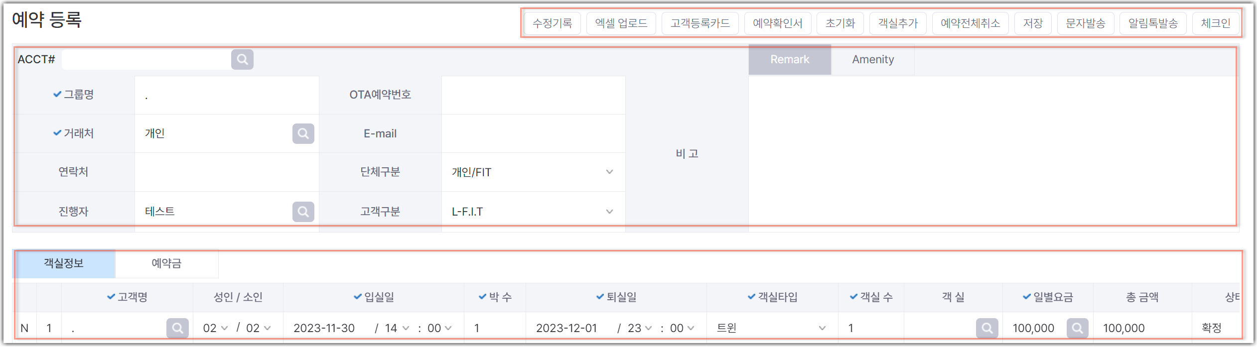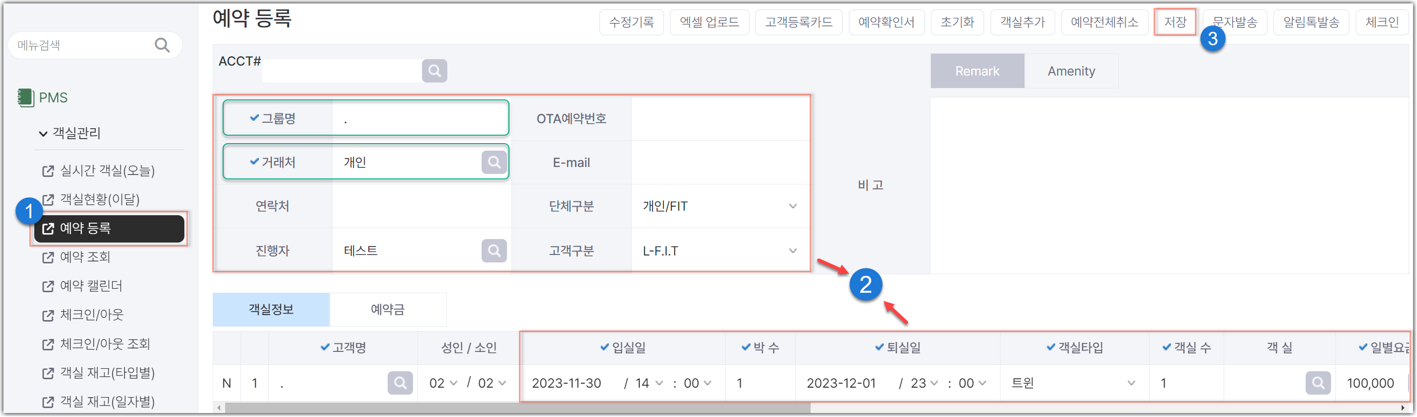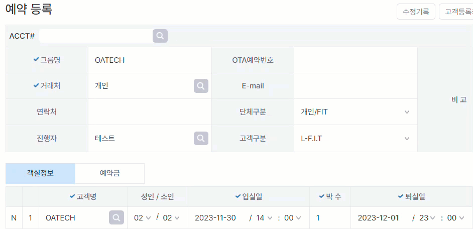 고객명, 인원수, 일자, 객실타입, 요금 등 입력합니다.