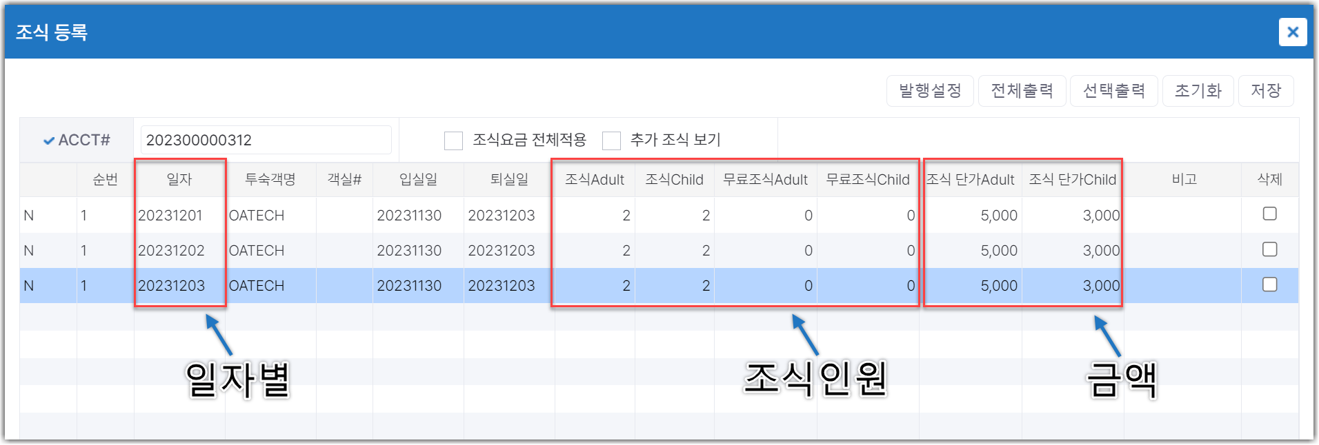 ii. 조식Adult, 조식Child : 예약정보에 입력된 성인/소인 인원 수 표기