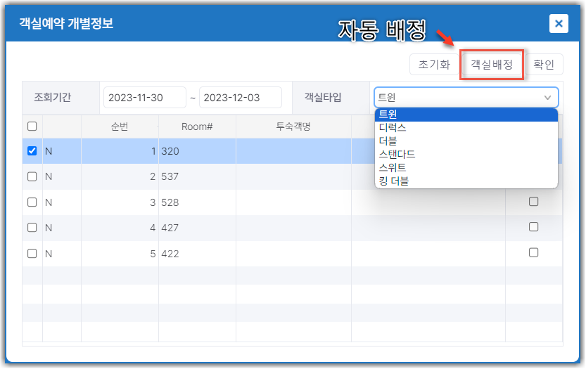 ii. 자동으로 배정하길 원하는 경우, 상단 [객실배정] 버튼을 클릭합니다.