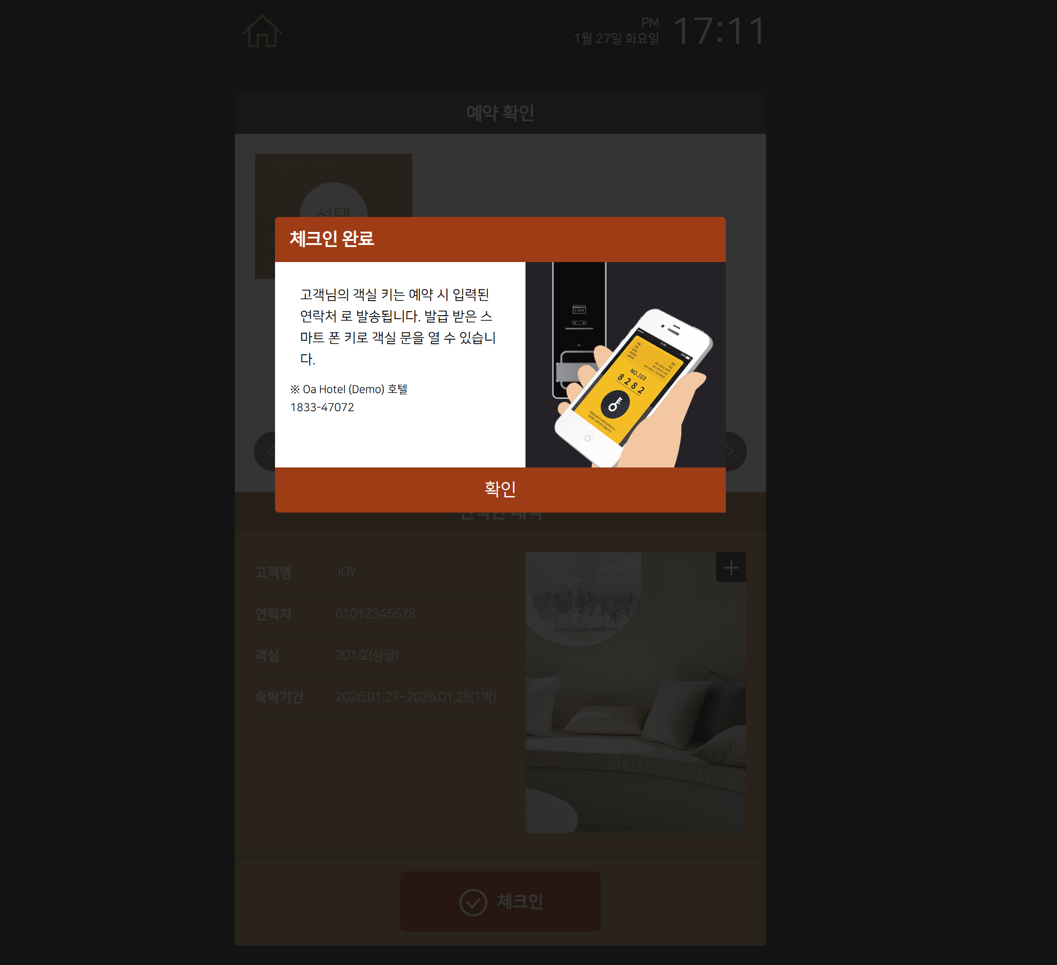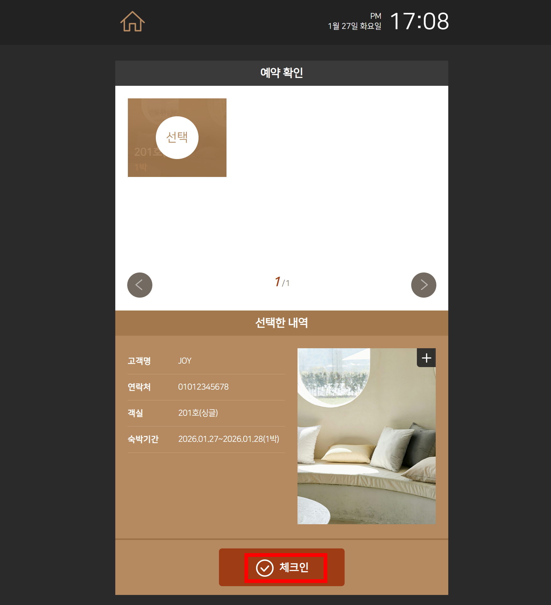객실타입 및 번호와 숙박기간을 확인 후, [체크인] 버튼을 클릭합니다.
