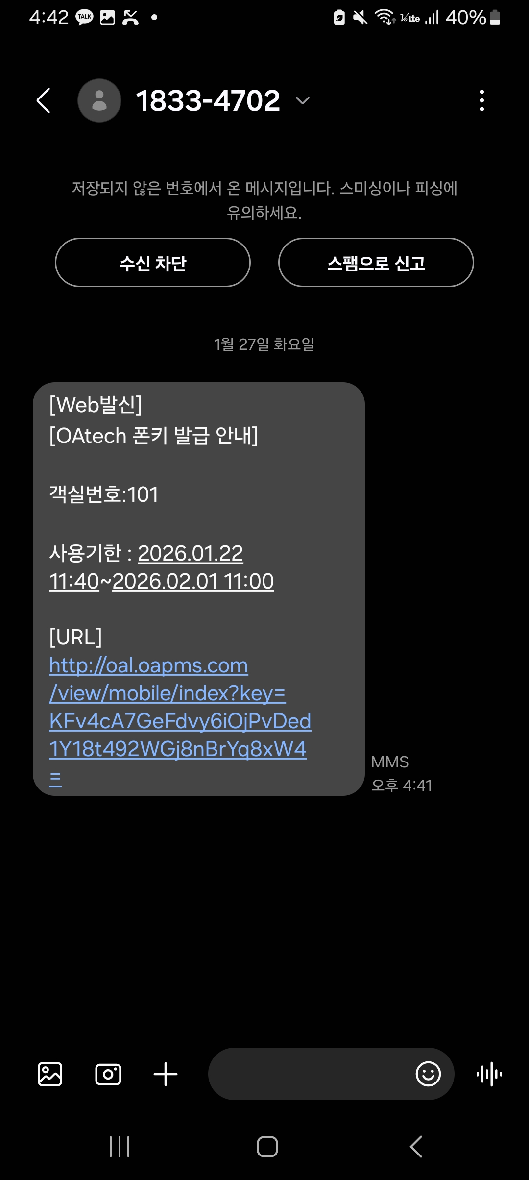 휴대폰으로 수신된 문자 내 모바일키 링크를 통해 입실이 가능합니다.