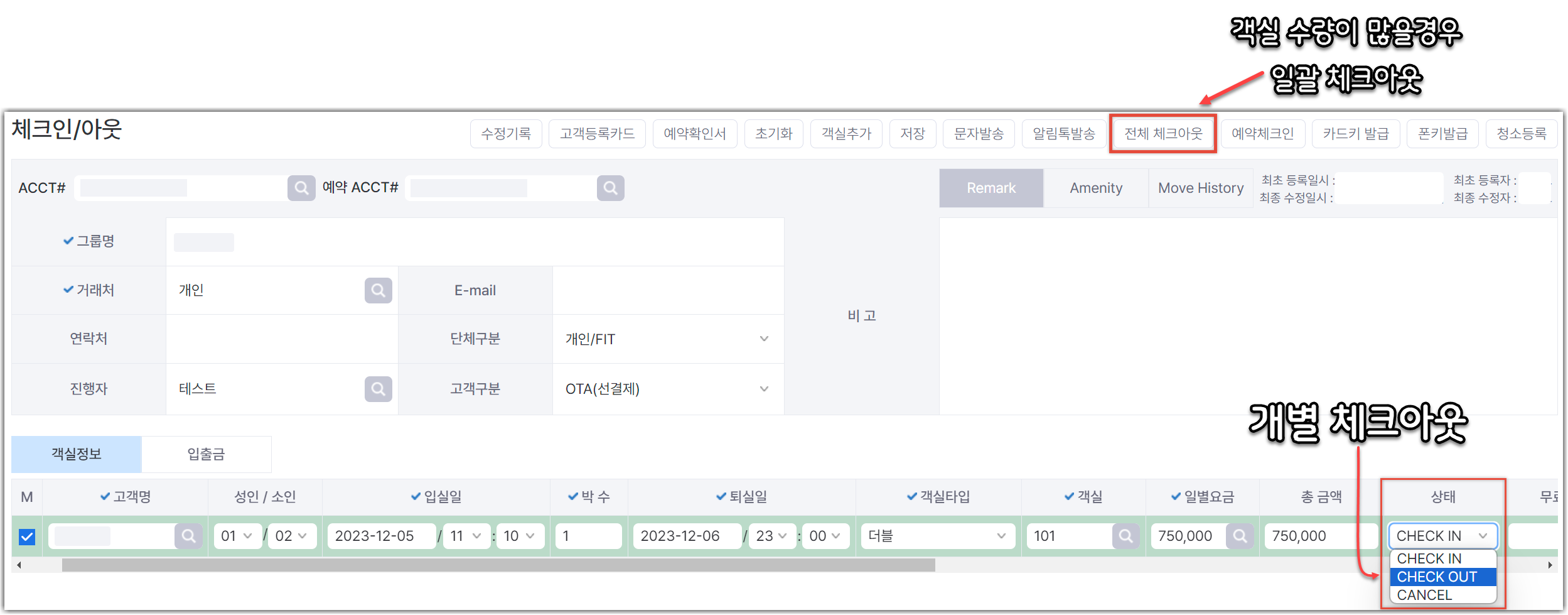 • 리스트 내 상태 칸에서 ‘체크아웃’으로 변경하거나