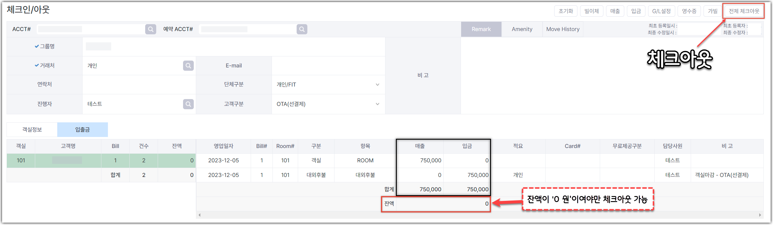 2. 매출/입금 잔액이 남아있을 경우 체크아웃 되지 않습니다.