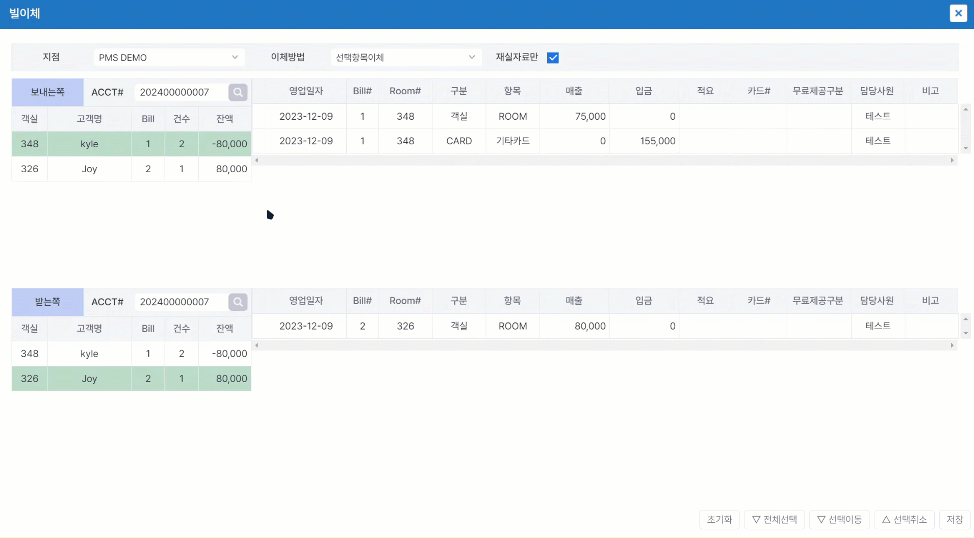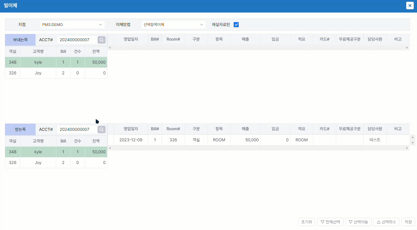 이체를 원하는 빌을 선택해서 선택이동한 뒤, 저장 버튼을 클릭합니다.
