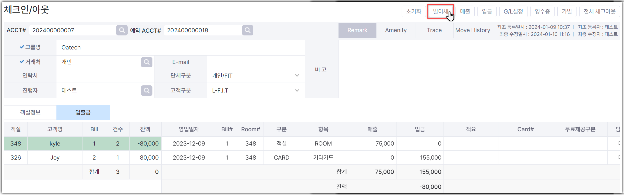 [Check In/Out] 메뉴에서 체크인된 예약건을 선택 후, 입출금 탭을 누른 뒤, 우측 상단 빌이체 버튼을 클릭합니다.