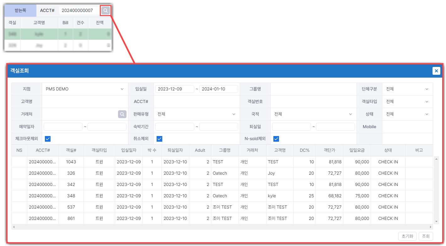 조회할 객실의 ACCT#가 생각나지 않을 경우, 돋보기를 클릭하여 해당 조건에 맞게 설정후 조회시 확인 가능합니다.