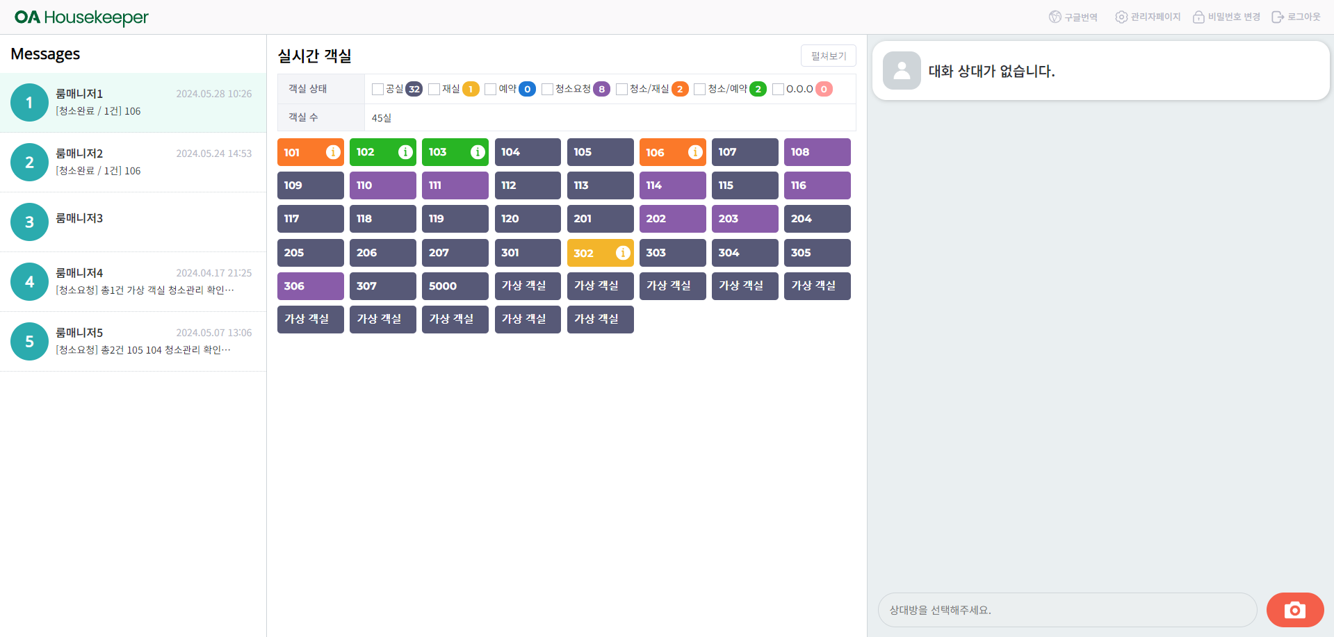 룸매니저 채팅 리스트 - 실시간 객실 상태 - 채팅창 순서로 구성