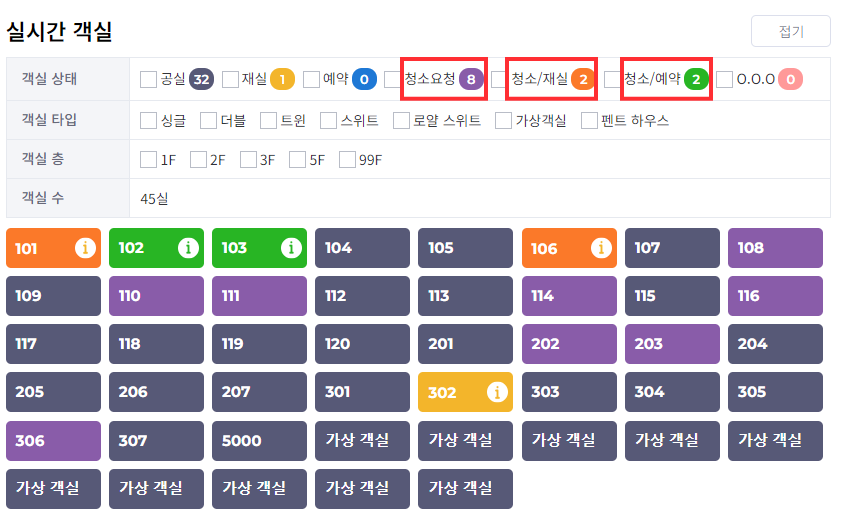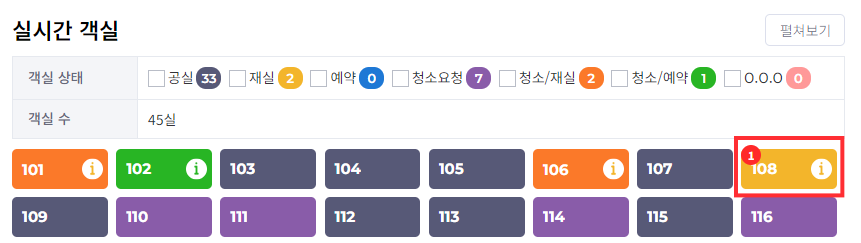 실시간 객실은 PMS의 실시간 객실상태와 연동되며, 해당 상태의 상태값은 청소가 필요한 객실입니다.