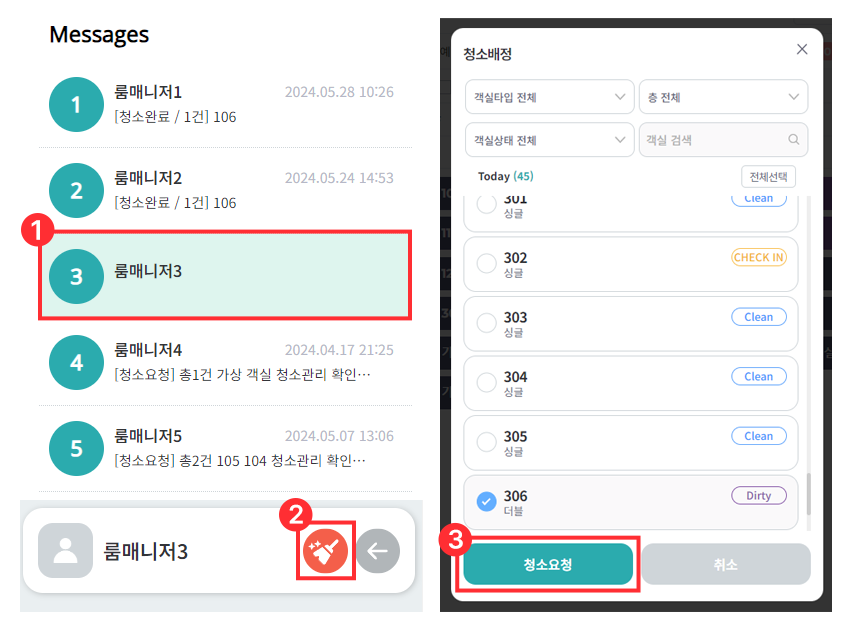 청소배정 팝업에서 객실 선택 후 청소요청 클릭