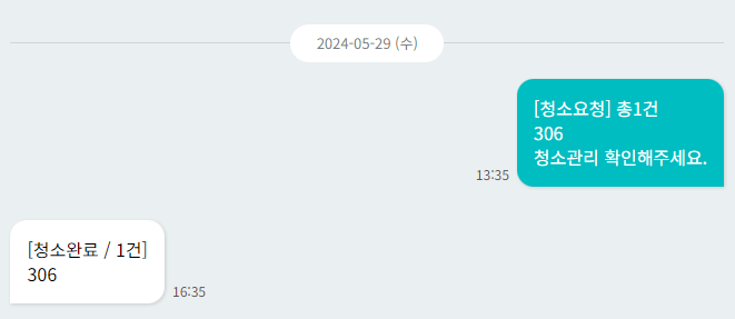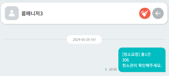 → 룸매니저 청소완료 메세지 전송 시 해당과 같은 메세지 확인 가능