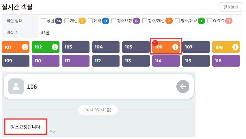 객실에서 청소 요청 시, 해당 객실에 채팅알림이 뜨며, 해당 객실 채팅창에서 청소요청 메세지 확인 가능