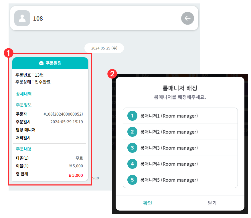 룸매니저 배정 팝업이 뜨면 룸매니저 선택 후 확인