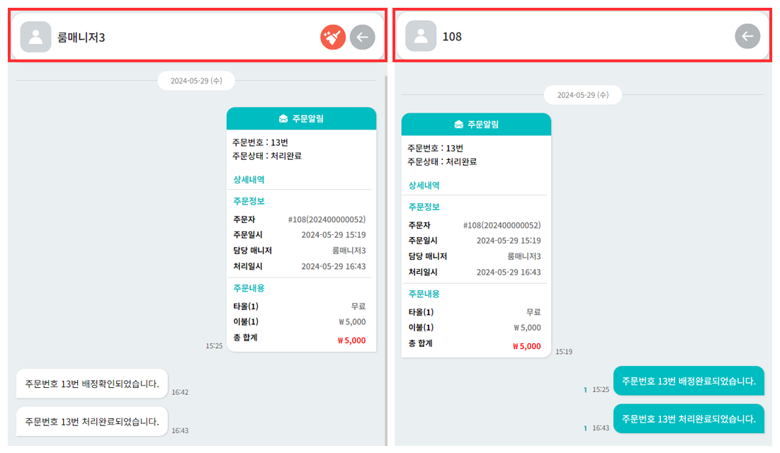 룸매니저 배정 시 → 배정 매니저 채팅창에서 주문알림 메세지 확인 가능
