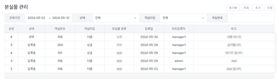 분실물 관리는 PMS → 객실관리 → 분실물 관리 페이지에서 확인 가능