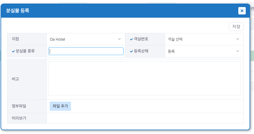 해당 분실물 더블 클릭 or 해당 분실물 클릭 후 우측 상단 수정 버튼 클릭 시 해당 팝업 나타남 분실물 상태에 따라 등록, 완료, 취소 선택 후 저장 가능