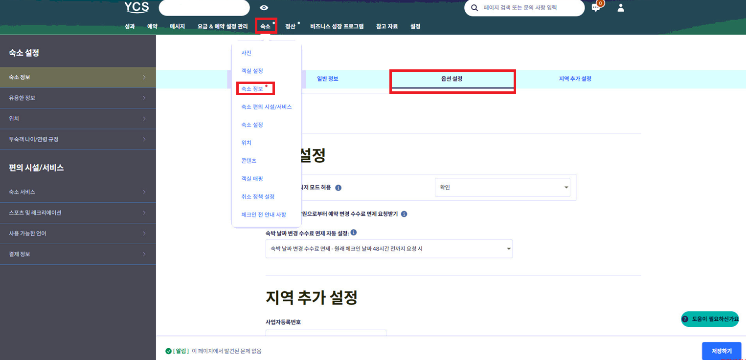 숙소 → 숙소 정보 → 옵션 설정