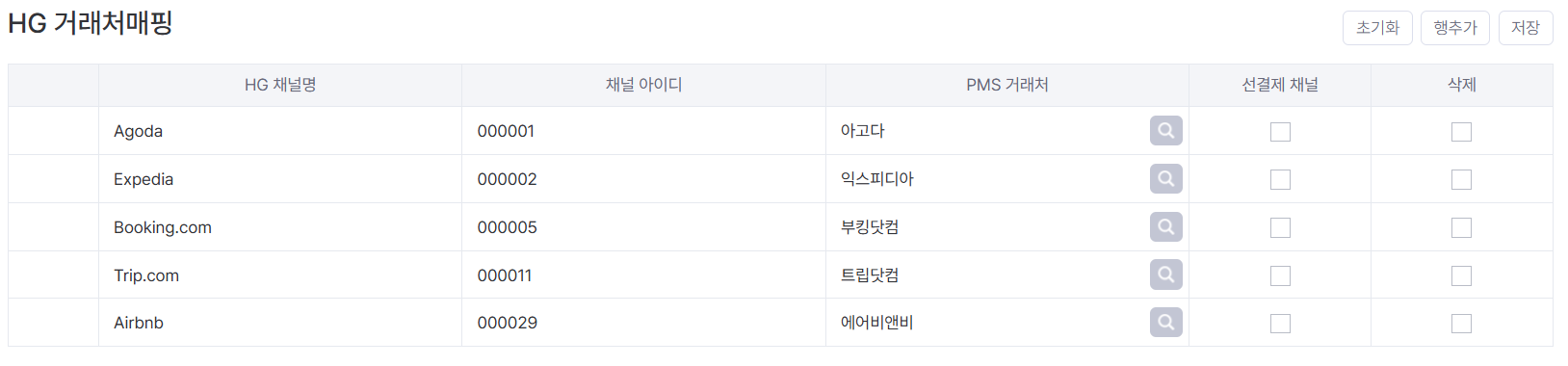객실타입(코드)과 채널(거래처) 매핑이 필요합니다.