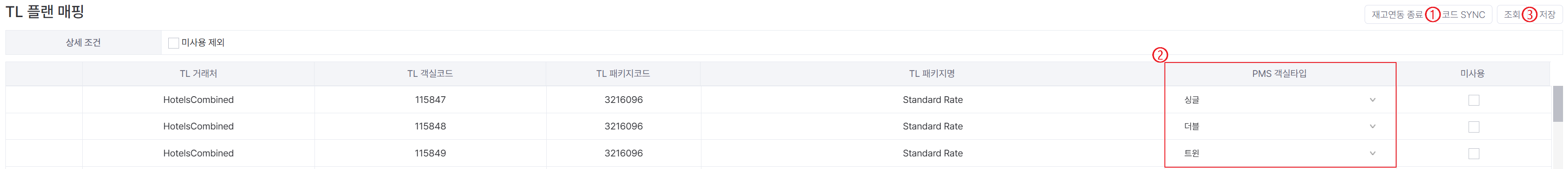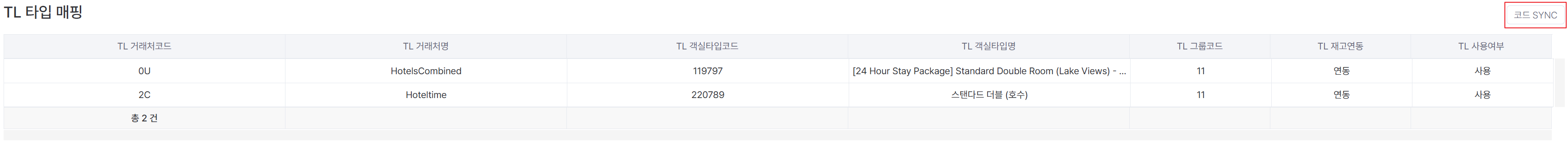 우측 상단의 코드 SYNC 버튼을 클릭해, TL린칸에 등록되어 있는 객실타입을 불러옵니다.